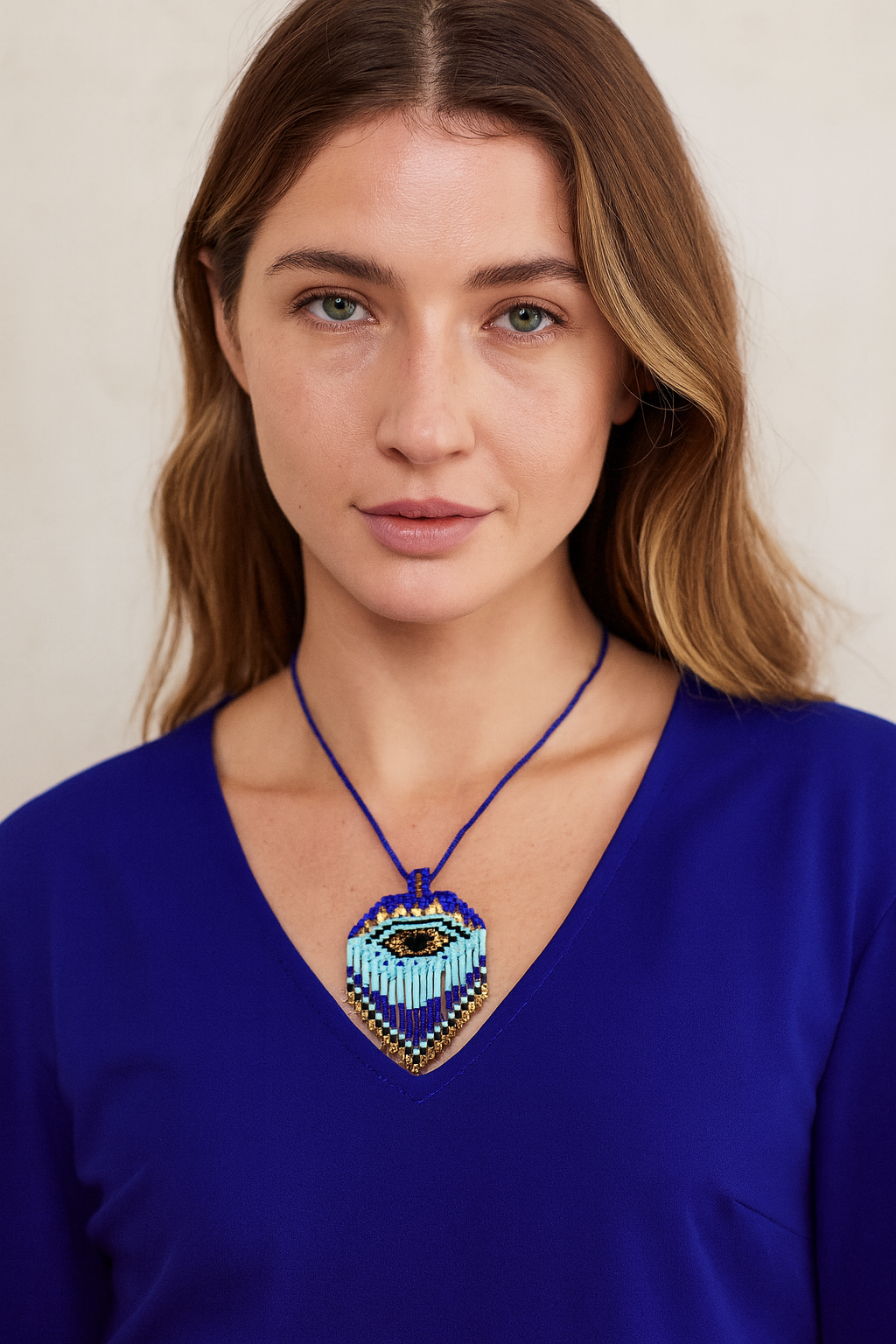 Need someone to watch out for you? We’ve got just what you’re looking for! It’s the Beaded Necklace with an Egyptian Eye camouflaging itself in Azure Blue, but standing out all the same!